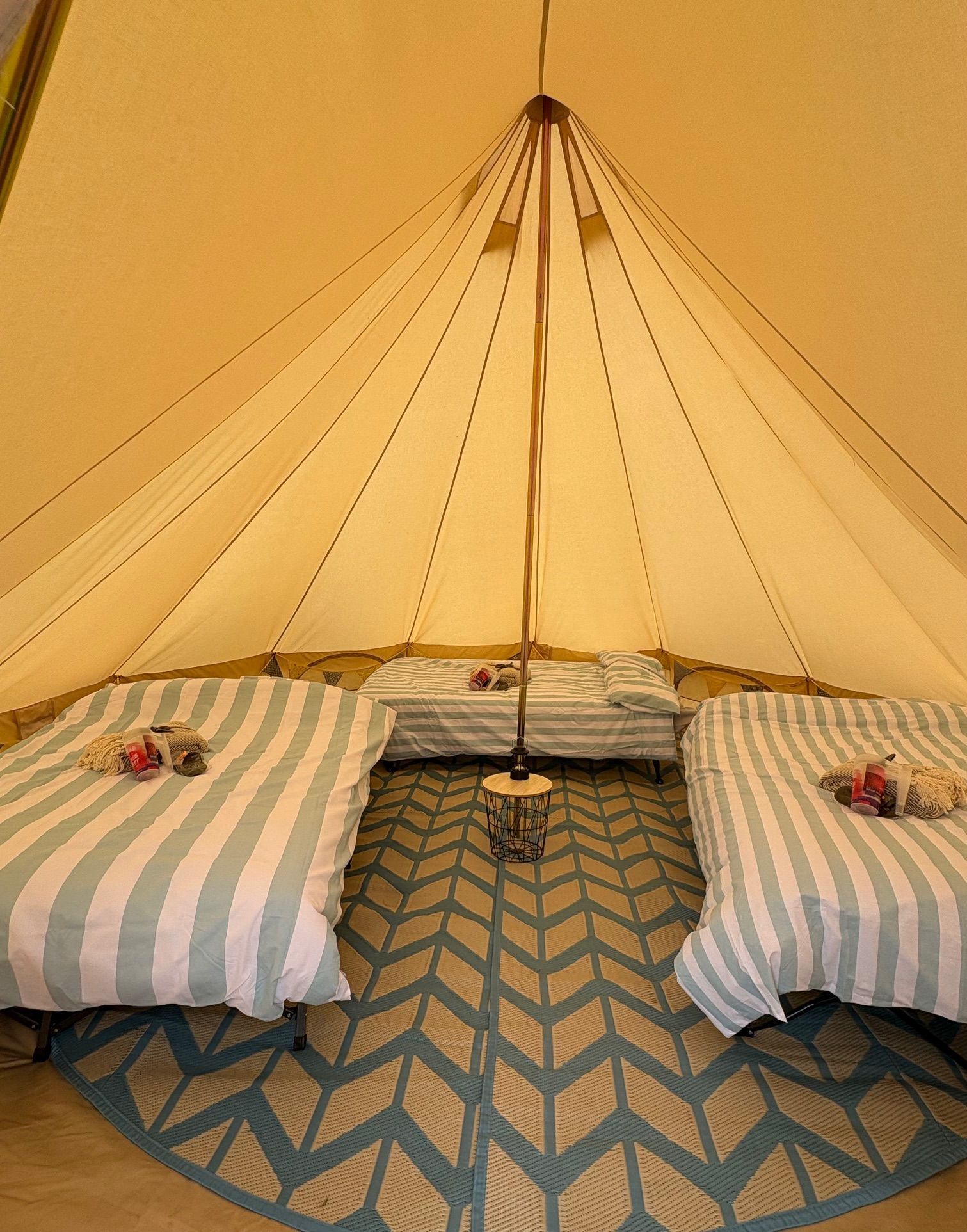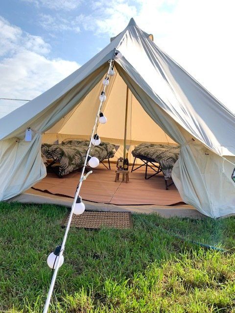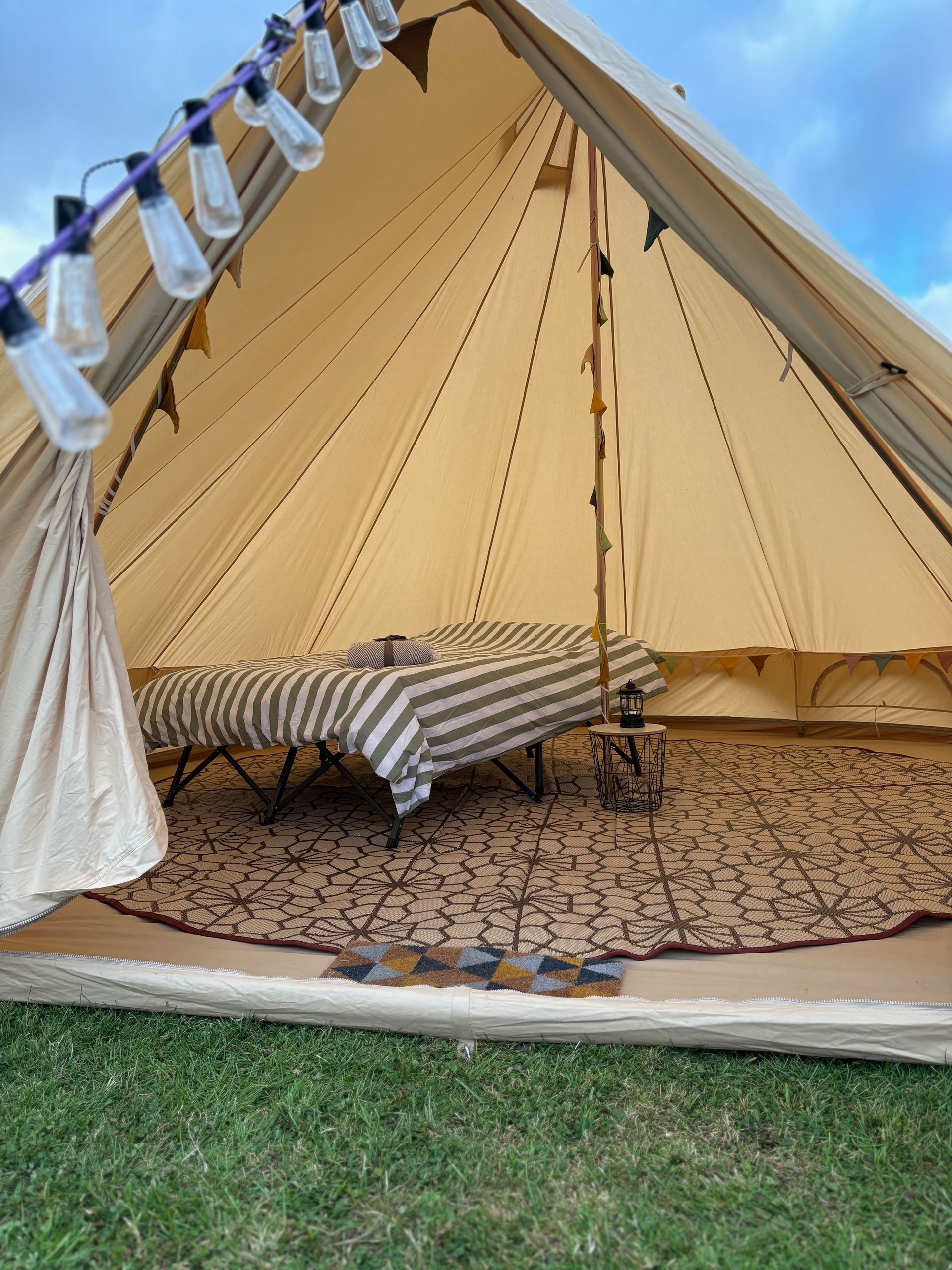 Each tent comes with floor matting, internal décor, small table and lantern, double campbed, memory foam mattress with bedding, external festoon lights, ear plugs and eye masks.