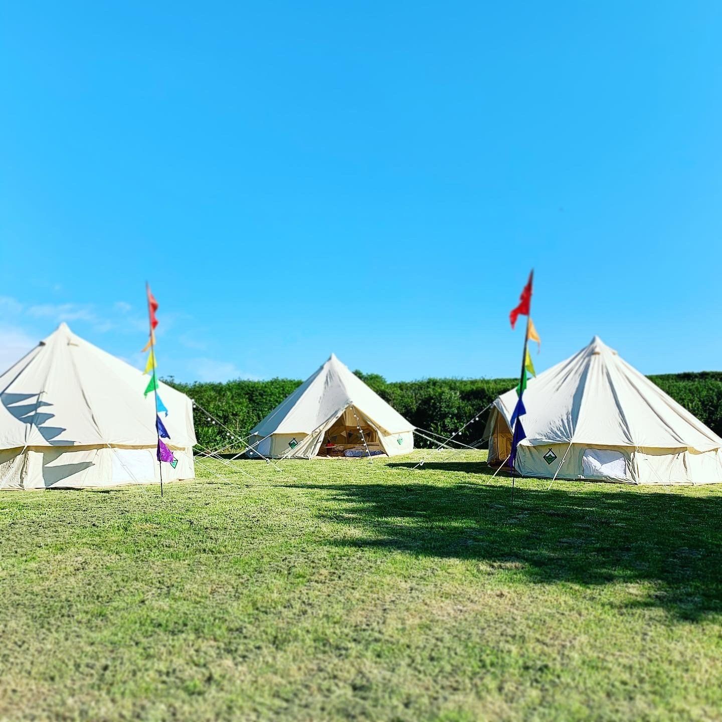 Furnished tent with floor matting, bunting, small table and lantern, double camp bed, memory foam mattress with bedding and festoon lights outside.